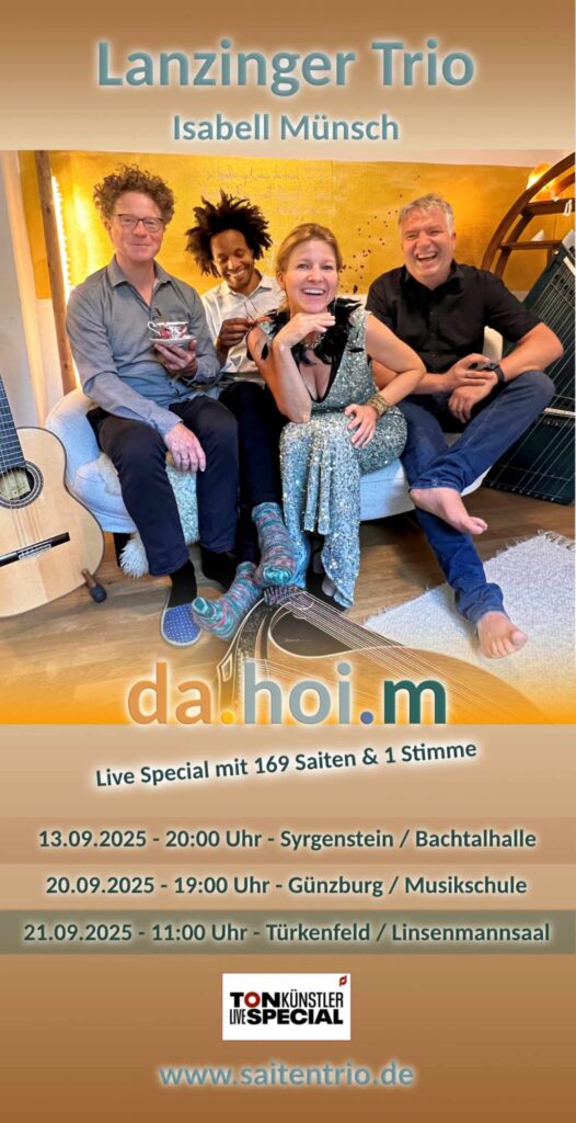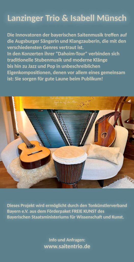 Wir freuen uns, dass wir mit dem „Lanzinger Trio“ wieder beim Tonkünstler Live Special mit dabei sein dürfen. Das Förderprojekt des Bayerischen Staatsministerium für Wissenschaft und Kunst ermöglicht uns, das Trio musikalisch voran zu bringen. Bei der diesjährigen Runde planen wir drei Konzerte mit der Augsburger Sängerin Isabell Münsch. Hier kommen die Termine: