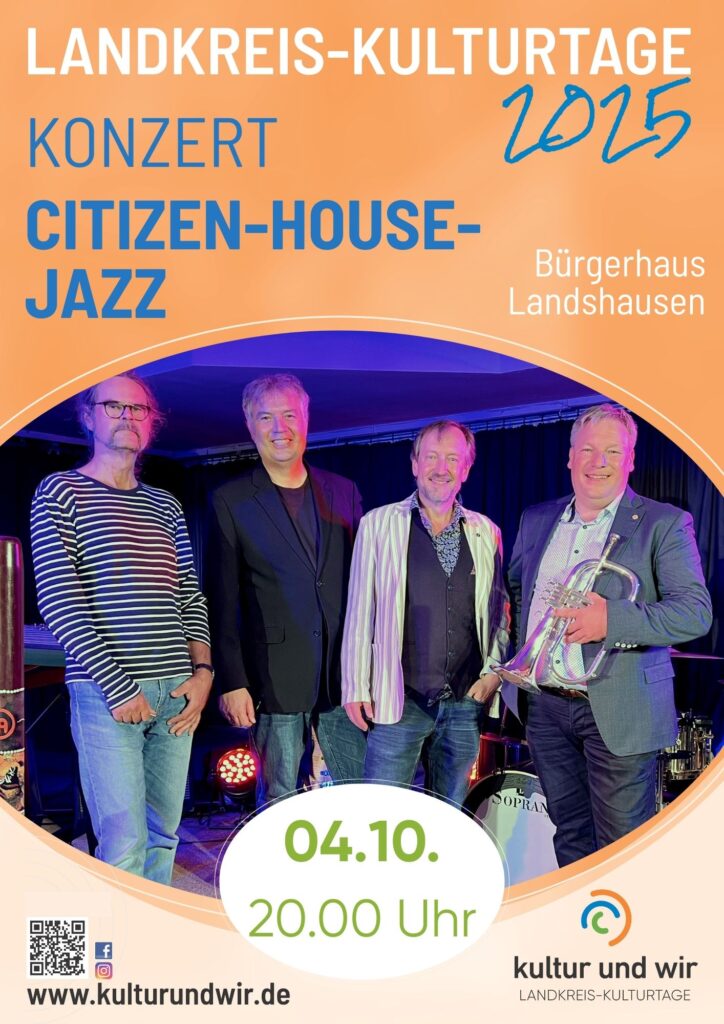 Am Samstag, 4. Oktober 2025 verwandelt sich das Bürgerhaus Landshausen wieder in einen Jazz-Club. Im Rahmen der Dillinger Kulturtage musizieren Ralf Huber (Trompete), Georg Hesse (Gitarre), Jörg Lanzinger (E-Bass) und Armin Egenter (Schlagzeug). Der Eintritt an der Abendkasse beträgt 15,00 €, Beginn ist um 20:00 Uhr.