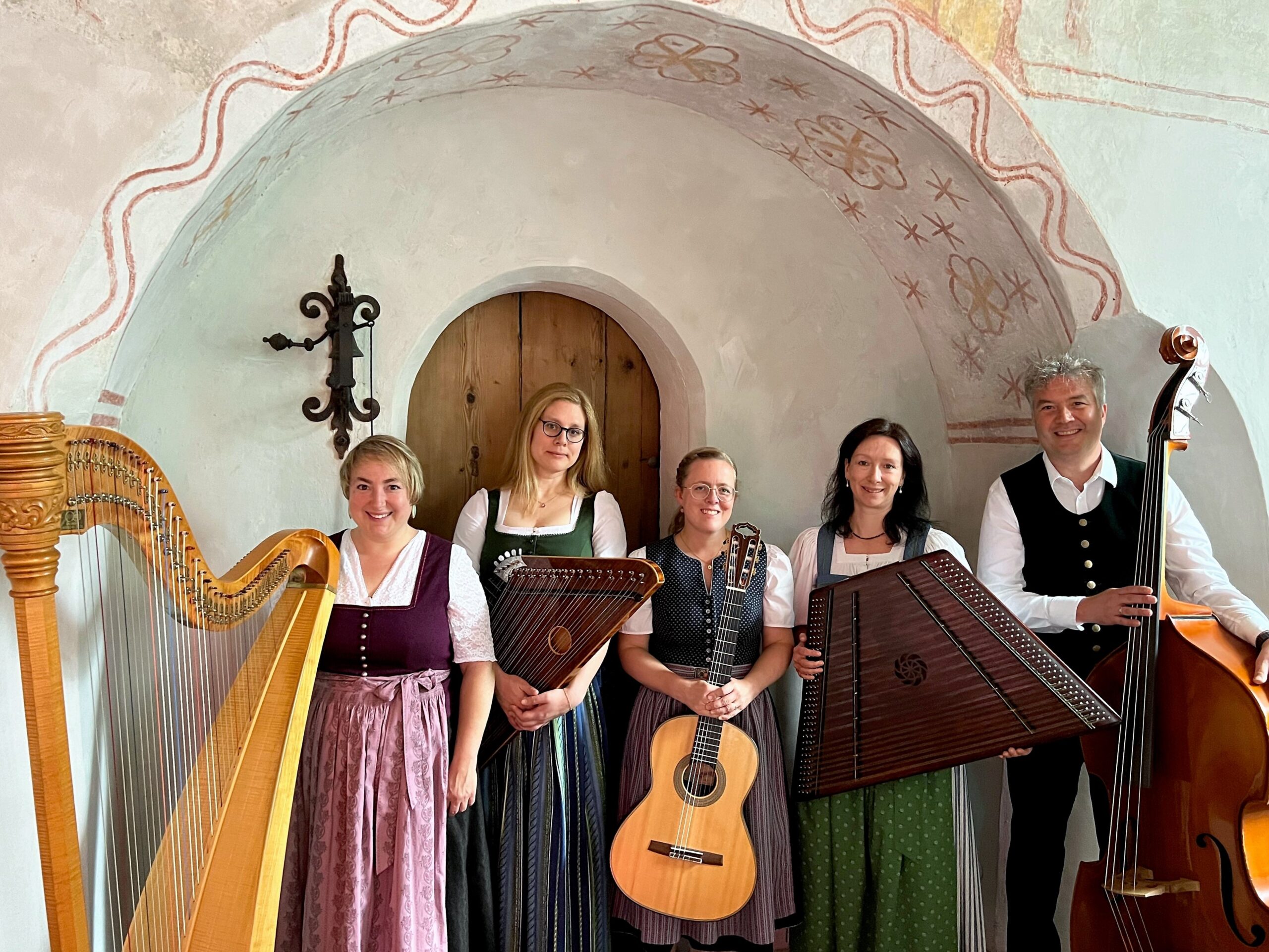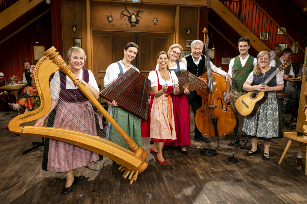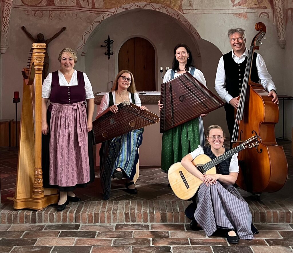 Traditionelle Volksmusik in einer traditionellen Stubenmusik-Besetzung mit Hackbrett, Zither, Harfe, Gitarre und Kontrabass (Saitenquintett).